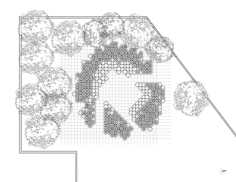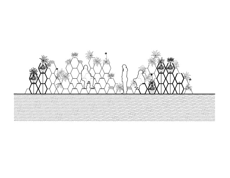 Escogimos utilizar la maceta como un objeto de diseño para ser recreado por nosotros y usado como un elemento arquitectónico. Al apilar las macetas estás nos envuelven en tierra, y al agregarle las plantas, creamos un pabellón viviente; el cual crecerá, se humedecerá y llenará de musgo y cuando llegue su momento, se puede hacer con él lo que solían hacer en la antigüedad, romperlo en pequeñas partes y regresarlo a la tierra.