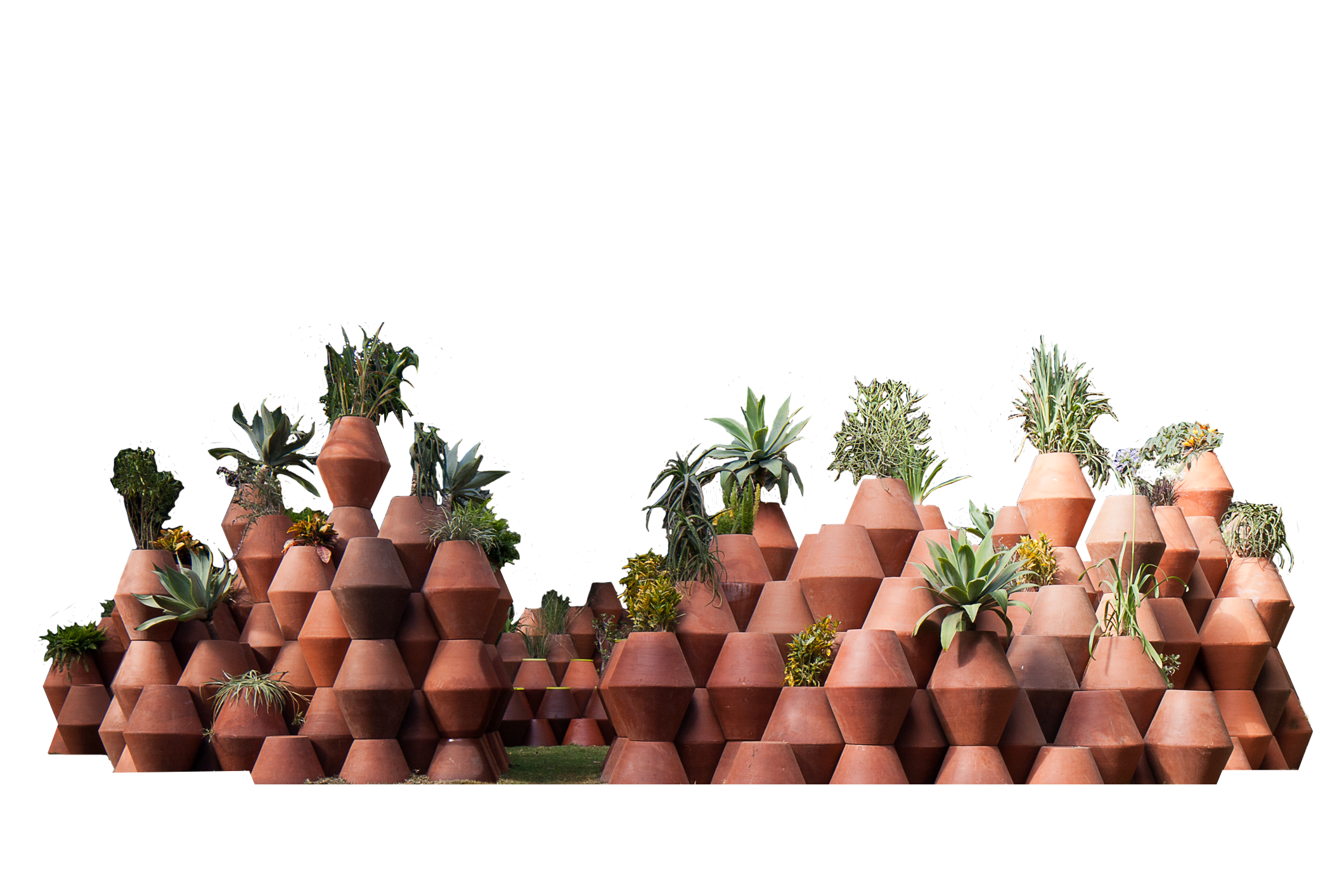 Escogimos la maceta como objeto de diseño, para ser recreada por nosotros y usada como elemento arquitectónico. Al apilarlas, las macetas nos envuelven en tierra; al añadir plantas, creamos un pabellón viviente que crecerá, se humedecerá y se llenará de musgo, y, cuando llegue el momento, se podrá hacer con él lo que se hacíar en la antigüedad: romperlo en pedazos y regresarlo a la tierra.